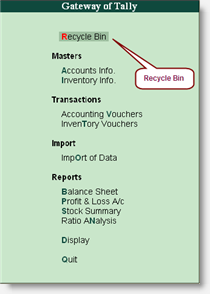 * Save the file and start Tally. You would see extra option of Recycle Bin.